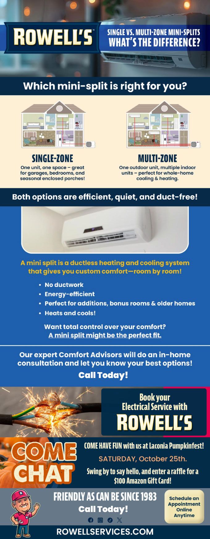 "Friendly As Can Be Since 1983!" When you need help with your plumbing, drains, heating, cooling or electrical in Meredith, you can always rely on Rowell's Services! Call us now or book online!